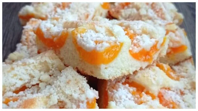 Drobenkový koláč s vanilkovým pudinkem a meruňkami